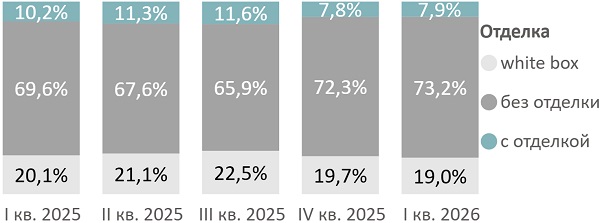 В I квартале сохранилась тенденция к росту доли предложения без отделки (73,2%, +0,9 п.п. за квартал) на фоне сокращения доли квартир, реализуемых в формате white box (19,0%, -0,7 п.п. за квартал) и с чистовой отделкой 7,9% (+0,1 п.п. за квартал).