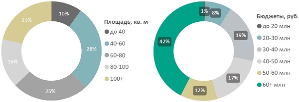 Распределение предложений на первичном рынке недвижимости премиум-класса по площадям и бюджетам, количество лотов